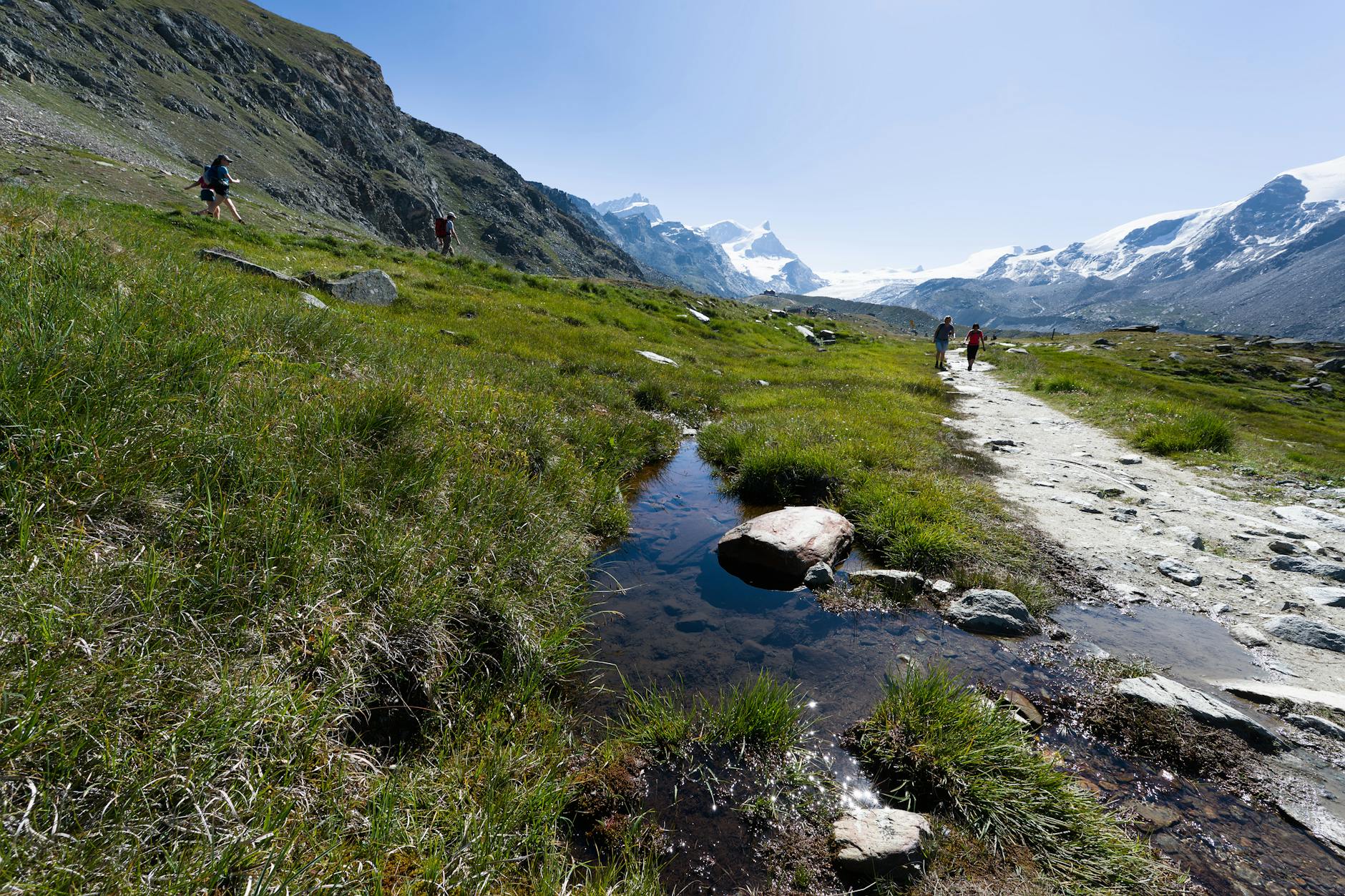Dobrym przykładem jest szlak wokół Zermatt – na przykład pętla przez jeziora Schwarzsee – Stafelalp – Zmutt lub rozbudowana wersja słynnego Five Lakes Walk. Klasyczna trasa przy pięciu jeziorach jest jeszcze dość łatwa, ale dodanie kolejnych podejść, zejścia do Zermatt zamiast powrotu kolejką czy podejścia do punktów widokowych na Matterhorn zamienia ją w solidny, całodzienny trekking. Teren bywa tu bardziej kamienisty, ścieżka miejscami węższa, a długość dnia szybko się rozciąga.